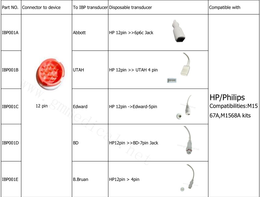 IBP001A :HP Kompatibel -Appott IBP Adapterkabel,10ft ,Hp12pin >>6p6c Jack IBP001B :HP-kompatibel -UTAH IBP-adapterkabel ,HP 12pin >> UTAH 4 stift IBP001C :HP Kompatibel-Edward IBP Adapter kabel , HP 12pin ->Edward-5pin IBP001D :HP-kompatibel -BD IBP Adapterkabel ,Hp12pin >>BD-7pin Jack IBP001E :HP Kompatibel -B.Bruan IBP Adapterkabel,Hp12pin > 4pin Compatibilities : M1567A, M1568A kit
