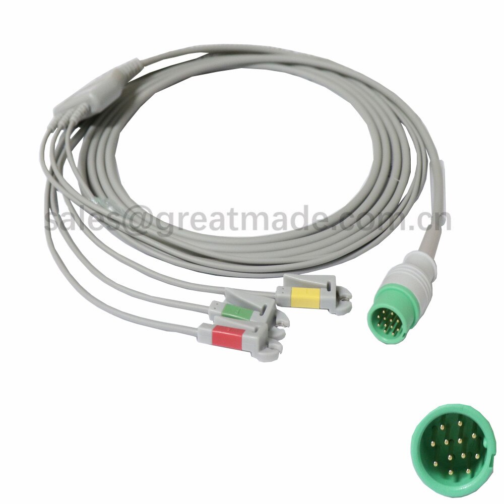 Kompatibel Biolight A3, A5, A6, A8, Q5 EKG-kabel med blyledning. IEC, 3-Lead, grabber, green 12pin