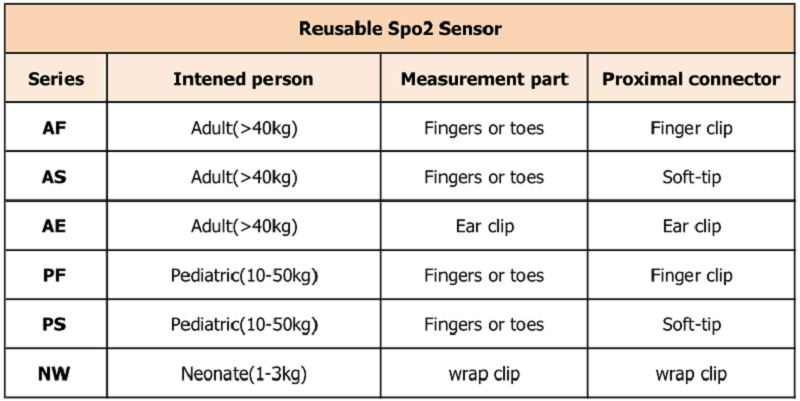 (AF&AS serie) Den fantastiska återanvändbara spo2-sensorn är ansluten till den kompatibla pulsoximetern för kontinuerlig icke-invasiv övervakning av funktionell syremättnad av arteriellt hemoglobin (SpO2) och pulsfrekvens (PR) för vuxna patienter som väger mer än 40 kg.